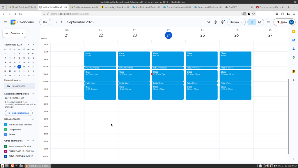 Per configurar l’horari acadèmic entra a calendari selecciona qualsevol dia i poses el nom que vols i les hores que es produeixen, després selecciones els dies que es volen repetir, repeteixes això en totes les classes i patis.