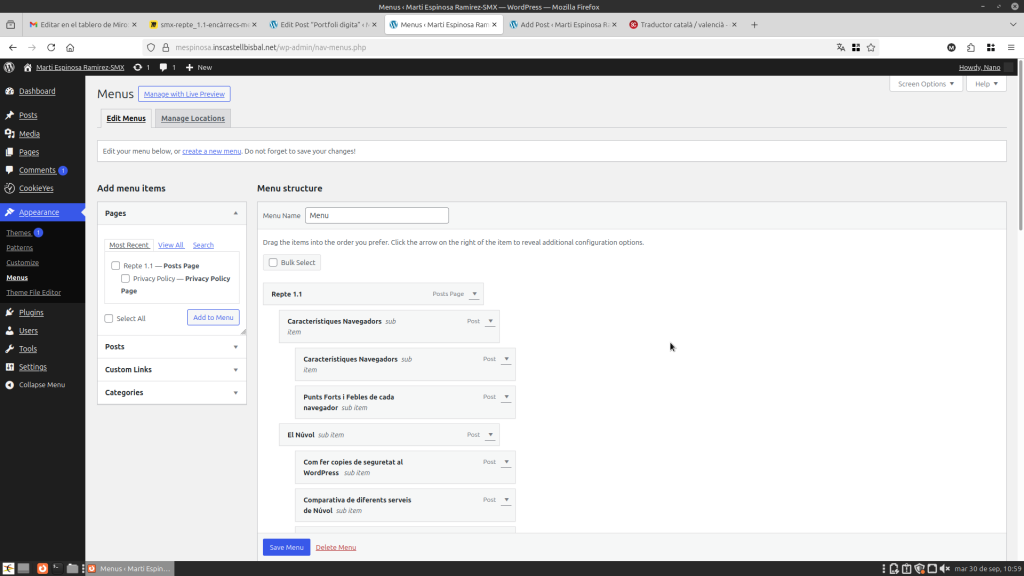 Per crear el menu has de anar als temes i ha menu. Creas el menu i poses el nom que vulguis. Despres a la part esquerra pots afegir totes les pagines o posts que vulguis afegir.