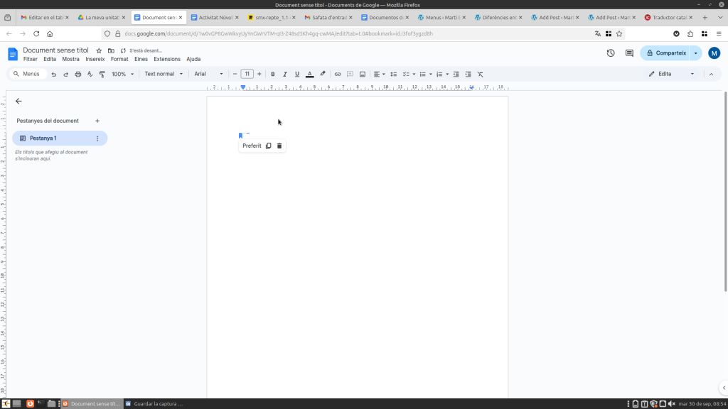 Per utilitzar un marcador a Documents de Drive has d’obrir un Document de Google i anar a la selecció d’ajuda, escrius marcador i seleccionés l’opció de Insisteix un marcador.