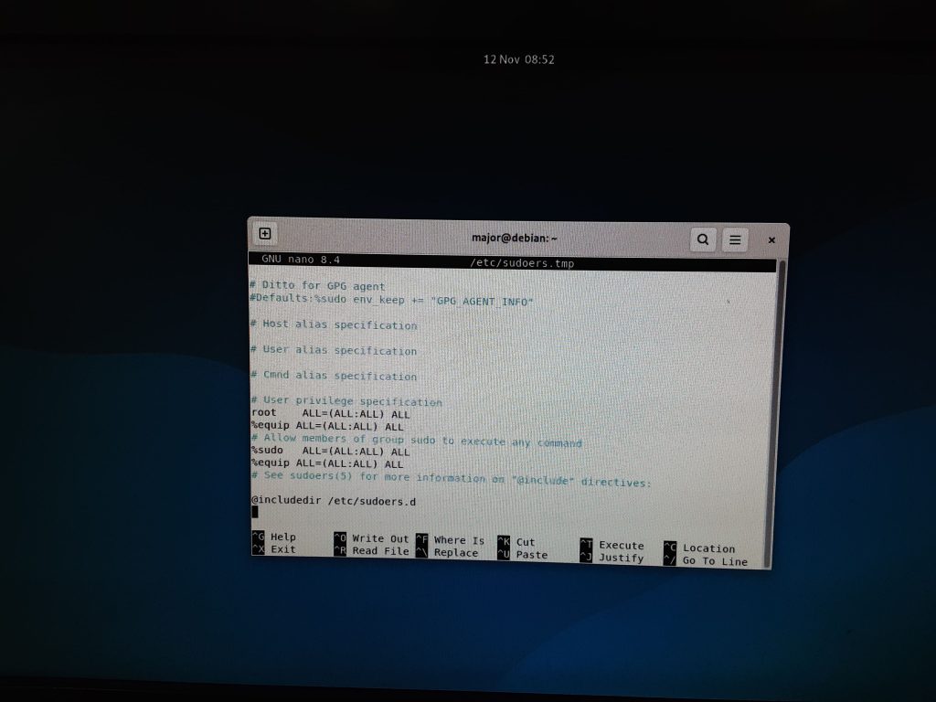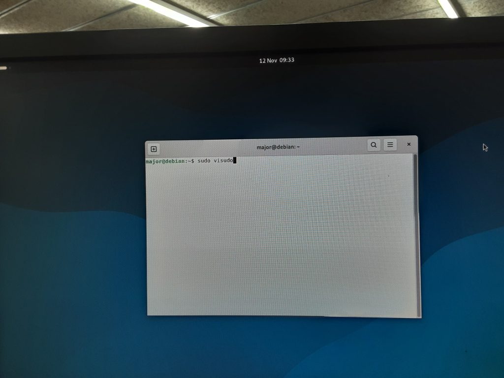 Primer per configurar els permisos vam utilitzar el comando sudo visudo amb l’usuari major.