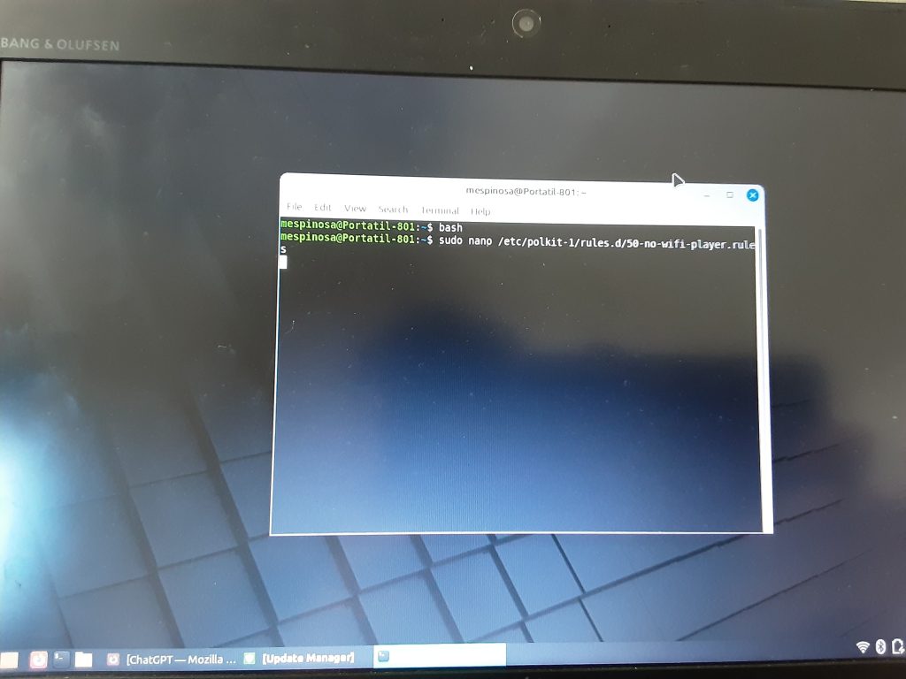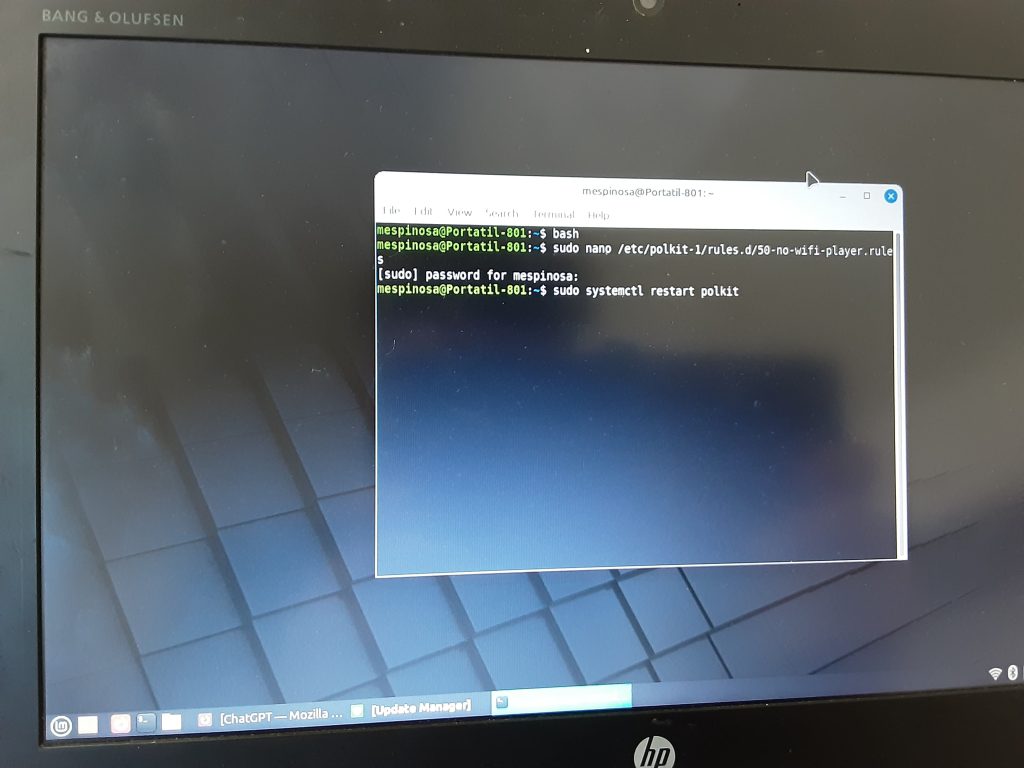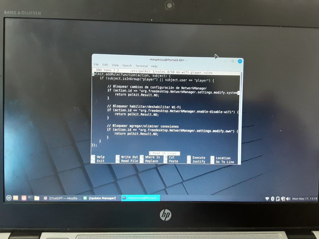 Per treure els permisos per afegir o treure xarxes primer vam crear un arxiu polkit sol per bloquejar a l’usuari “player”.