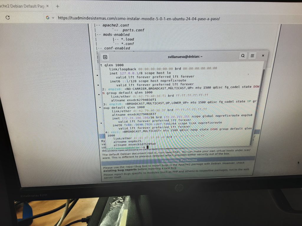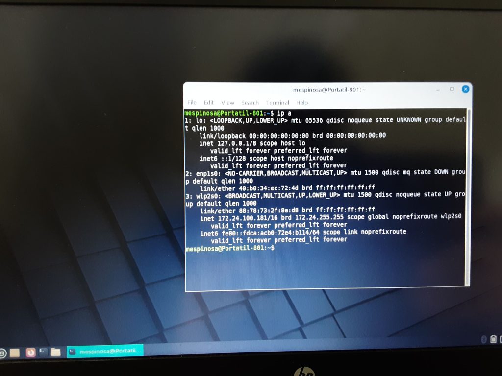 Per saber la IP i el MAC dels portàtils hem utilitzat el comando “ip a” en la terminal.