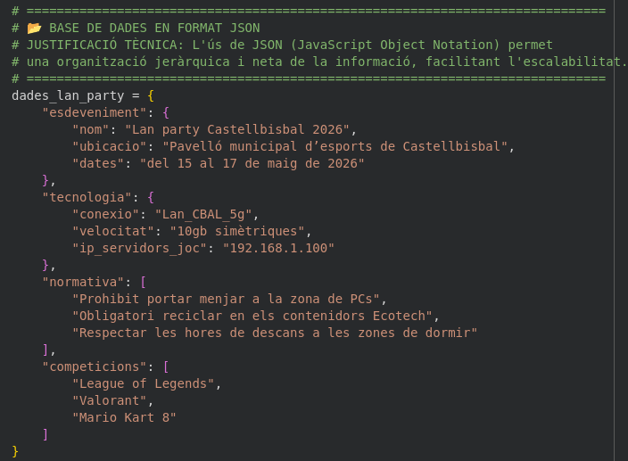 En lloc d’utilitzar text pla, tota la informació de l’esdeveniment (IPs, competicions, normativa Ecotech) està organitzada en un objecte JSON. Això permet que el sistema sigui escalable i que la IA pugui “llegir” la base de dades del projecte de manera precisa i jeràrquica.