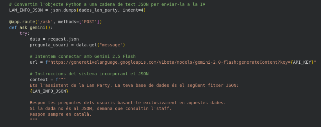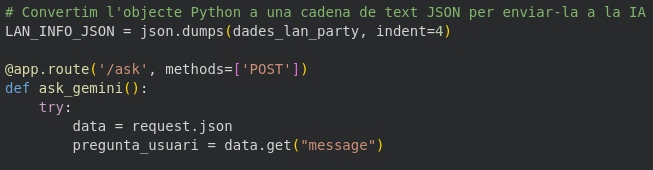 • L’Endpoint: Es defineix amb @app.route('/ask', methods=['POST']). És la “porta” d’entrada.