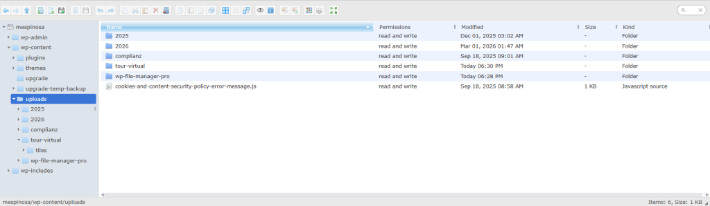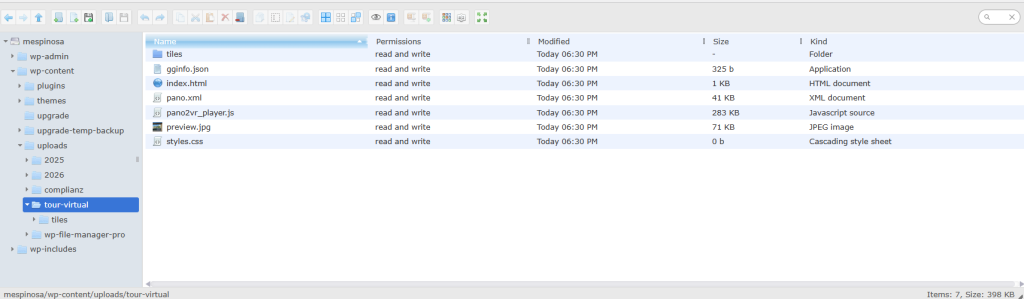 Mitjançant el File Manager, vaig navegar fins a la ruta /wp-content/uploads/. Vaig crear una carpeta nova anomenada tour-virtual per mantenir el servidor net i organitzat. Vaig pujar tots els fitxers extrets anteriorment, comprovant que el fitxer index.html estigués a l’arrel d’aquesta carpeta.