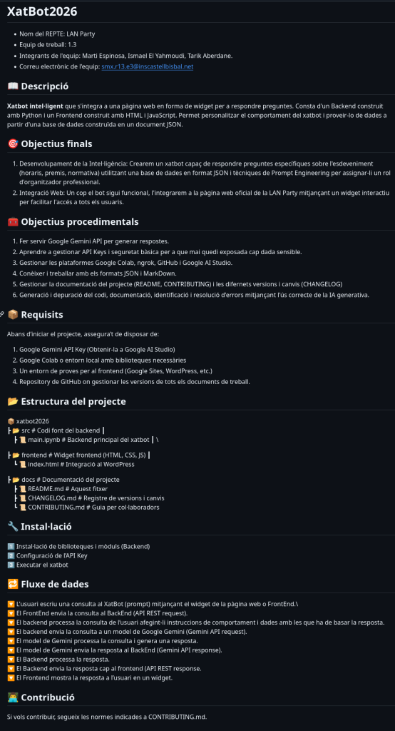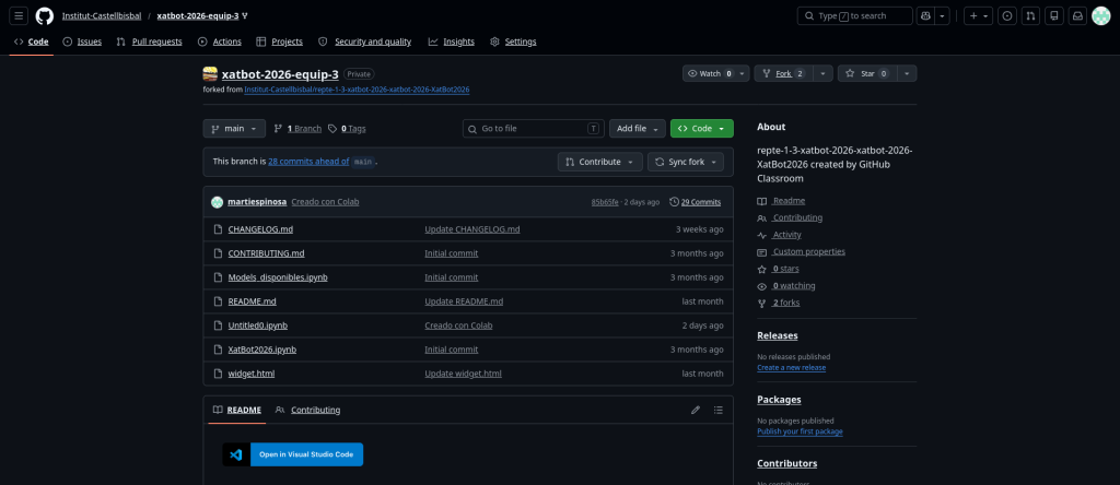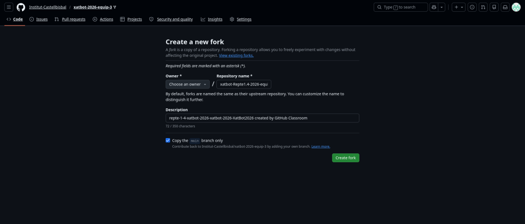Per començar aquest projecte, primer necessitem una bona organització de l’entorn de treball. El primer, que he fet un fork (una còpia) al repositori ja creat de l’equip del repte 1.3 al meu propi compte.